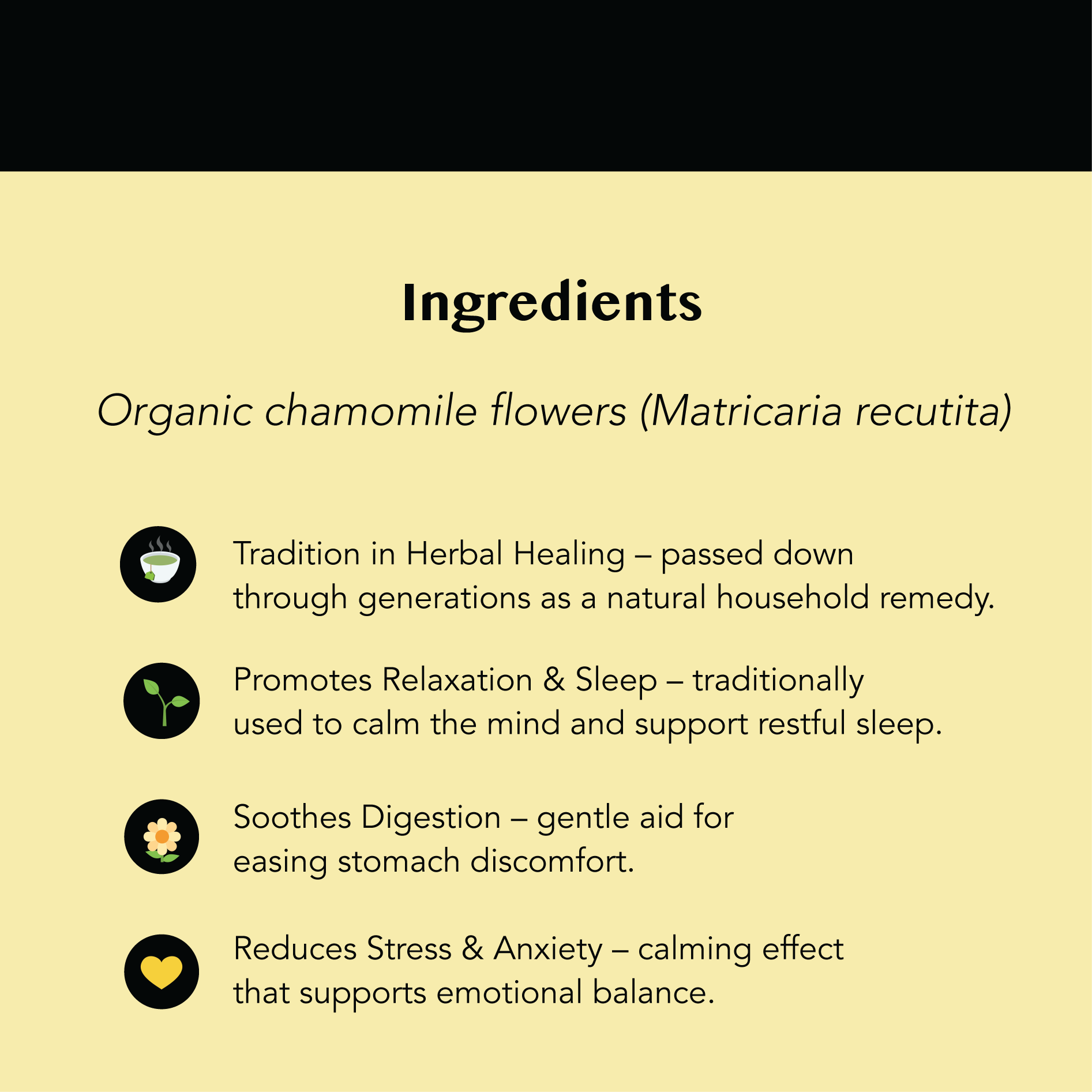 The warm yellow conveys feelings of comfort, calm, and natural light, reflecting the soothing qualities of chamomile tea. It suggests freshness, positivity, and a gentle, uplifting mood.